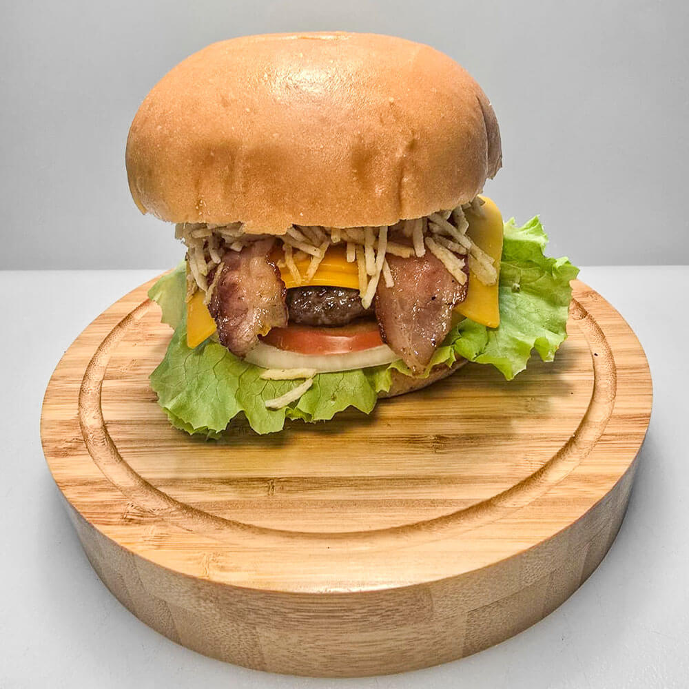 Meat, cheddar cheese, bacon, lettuce, tomato, onion and chips.
