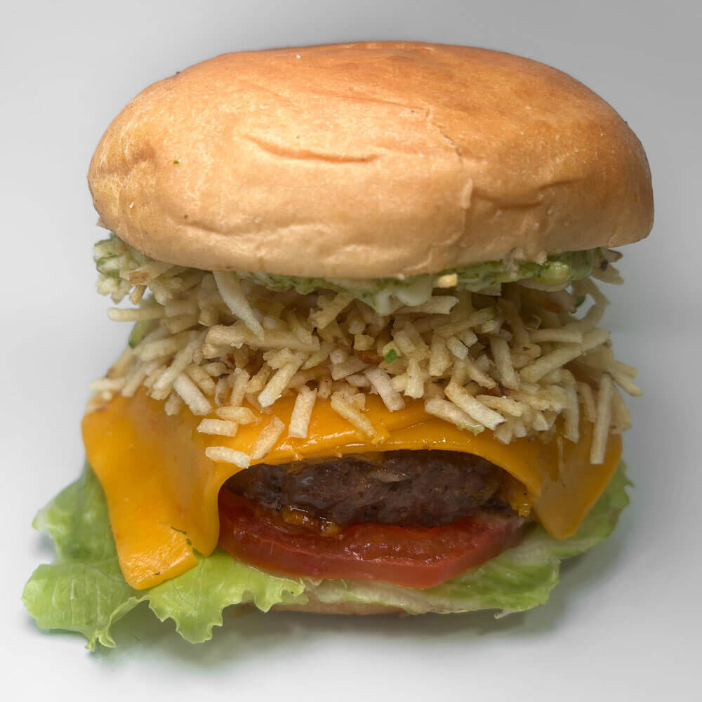 Meat, cheddar cheese, lettuce, tomato, onion and chips.